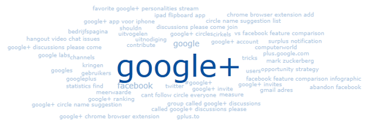 Hoewel veel mensen nog niet precies weten wat ze ermee kunnen en vooral anderen aan het uitnodigen zijn, wordt Google+ al wel vergeleken met andere netwerksites zoals Facebook. Als we namelijk kijken naar trending topics rondom Google+, zien we vooral woorden als "uitnodiging", "uitvogelen", "circles" en "facebook" terugkomen. Onderstaande cloudtag laat de belangrijkste trending topics zien over de afgelopen drie maand.